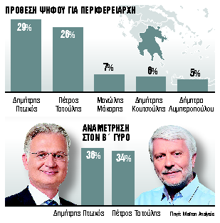 Συνθήκες εκλογικού ντέρμπι στην Περιφέρεια Πελοποννήσου καταγράφει δημοσκόπηση της Metron Analysis, με τον επίσημο «γαλάζιο» υποψήφιο Δημήτρη Πτωχό να καταγράφει σαφή αύξηση της δυναμικής του και μικρό προβάδισμα απέναντι στον πρώην περιφερειάρχη Πέτρο Τατούλη, με 29% έναντι 26% στην πρόθεση ψήφου.