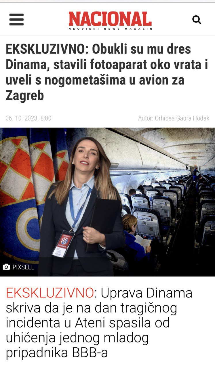 Η Nacional έμαθε από πολλές πηγές κοντά στην ηγεσία της Dinamo Football Club ότι ολόκληρος ο σύλλογος είναι «πάνω σε αναμμένα κάρβουνα» εδώ και ενάμιση μήνα από φόβο μήπως διαρρεύσει πληροφορίες στο κοινό για το πώς στις 8 Αυγούστου, όταν το αεροπλάνο με όλη η ομάδα της Ντιναμό επέστρεφε από την Αθήνα αφού ο αγώνας με την ΑΕΚ ακυρώθηκε λόγω ταραχών στις οποίες σκοτώθηκε ένας Έλληνας οπαδός, υπήρχε ένας «περίεργος επιβάτης» σε εκείνο το αεροπλάνο.