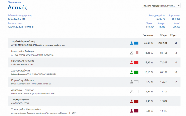 Σύμφωνα με τα αποτελέσματα του υπουργείου Εσωτερικών στο 42,76% της ενσωμάτωσης ο Νίκος Χαρδαλιάς έχει πάρει το 46,42% των ψήφων έναντι 15,86% του κ. Ιωακειμίδη.