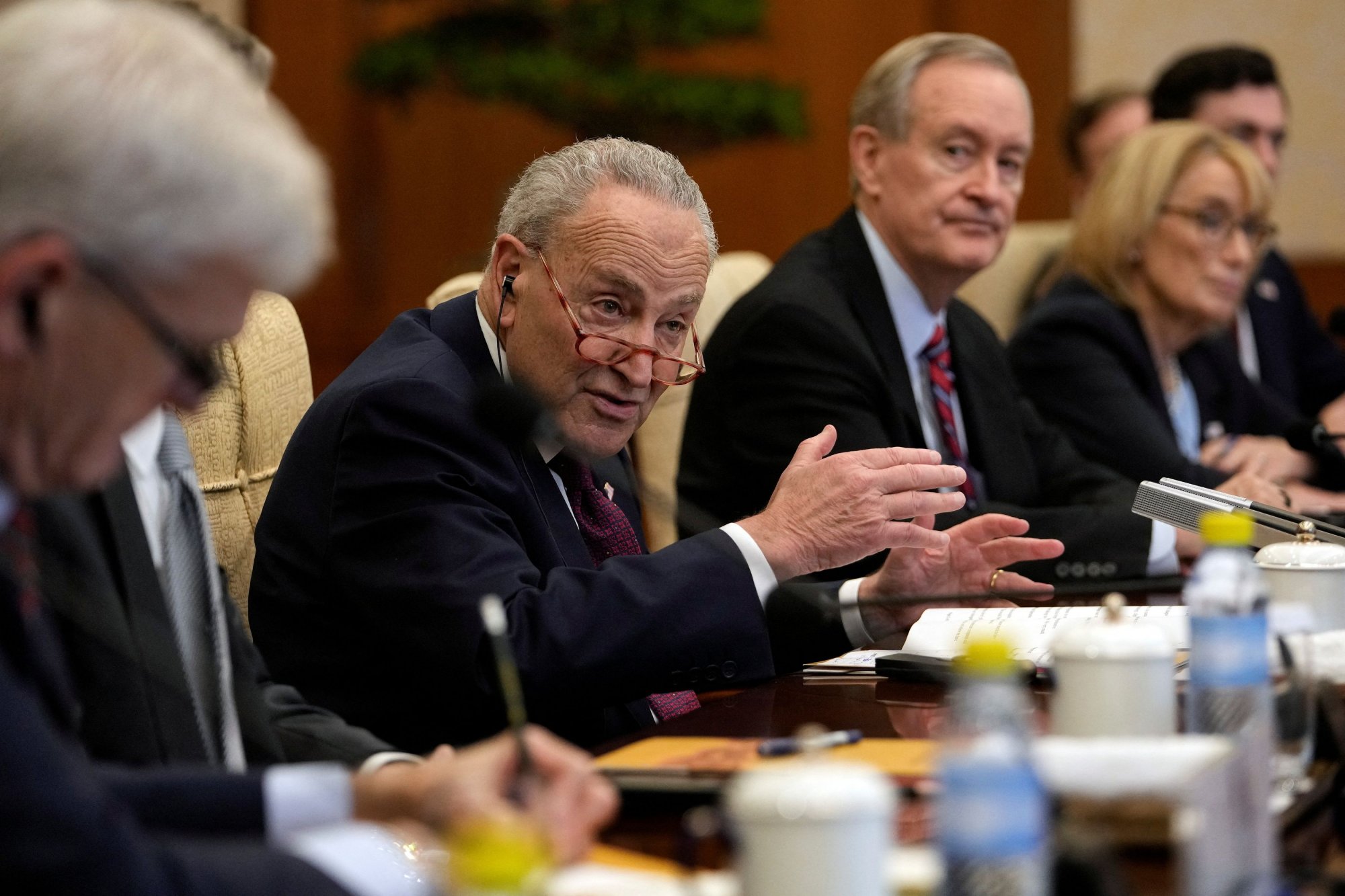 Από αριστερά, ο γερουσιαστής Μάικ Κράπο, ο επικεφαλής των Δημοκρατικών στη Γερουσία, Τσακ Σούμερ, και ο επικεφαλής της Κινεζικής διπλωματίας, Ουάνγκ Λι, στο Πεκίνο, 9 Οκτωβρίου 2023. Andy Wong/Pool via REUTERS