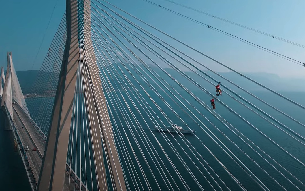 Πλάνα που «κόβουν» την ανάσα έρχονται από τη Γέφυρα Ρίου-Αντιρρίου, όπου εκτελέστηκαν εργασίες επιθεώρησης από εξειδικευμένους Γάλλους αλπινιστές, οι οποίοι αιωρούνται σε ύψος εκατονάδων μέτρων πάνω από την επιφάνεια της θάλασσας προκειμένου να ελέγξουν και να διαβεβαίωσουν για την ασφάλεια των δερχόμενων πολιτών με τα οχήματά τους.