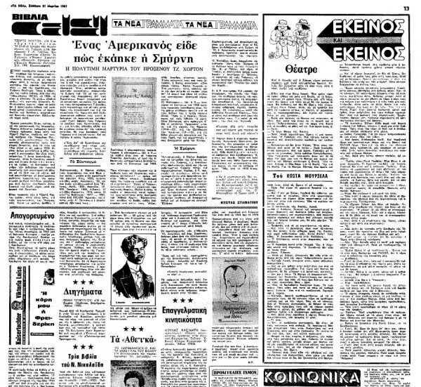 *Άρθρο του διακεκριμένου δημοσιογράφου, λογοτεχνικού κριτικού και μεταφραστή Κώστα Σταματίου (1929-1991) για τον Τζωρτζ Χόρτον και τη Μικρασιατική Καταστροφή. Έφερε τον τίτλο «Ένας Αμερικανός είδε πώς εκάηκε η Σμύρνη» και είχε δημοσιευτεί στην εφημερίδα «Τα Νέα» το Σάββατο 21 Μαρτίου 1981, με αφορμή την κυκλοφορία του βιβλίου-ντοκουμέντου του Χόρτον «Η Κατάρα της Ασίας» (μετάφραση Γεωργίου Λ. Τσελίκα), δαπάναις σμυρναίικων και θρακικών σωματείων.