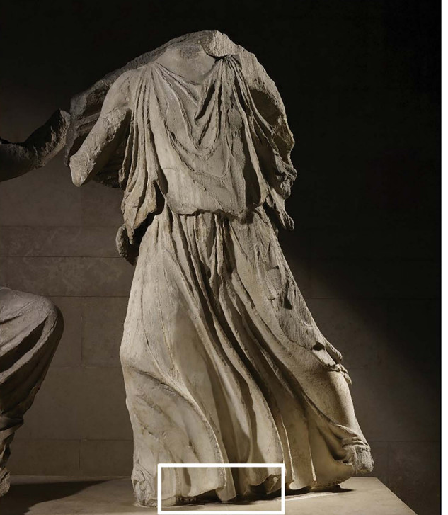 Εντυπωσιακές είναι και οι λεπτομέρειες από το άγαλμα της Διώνης, μητέρας της Αφροδίτης, η οποία παρουσιάζεται ξαπλωμένη δίπλα στην κόρη της. Όπως αναφέρει το δημοσίευμα, εξετάζοντας την κατανομή του αιγυπτιακού μπλε στο σχέδιο του χιτώνα της Διώνης, οι ερευνητές εντόπισαν την εικόνα δυο ανθρώπινων ποδιών που τρέχουν, μαζί με άλλες εικόνες που πιστεύουν ότι μπορεί να δείχνουν ένα χέρι και ένα πόδι, μέρος ενός «υφαντού σχεδίου με ανθρώπινες φιγούρες που εμφανίζονται και εξαφανίζονται ανάμεσα στις πτυχές του ενδύματος».
