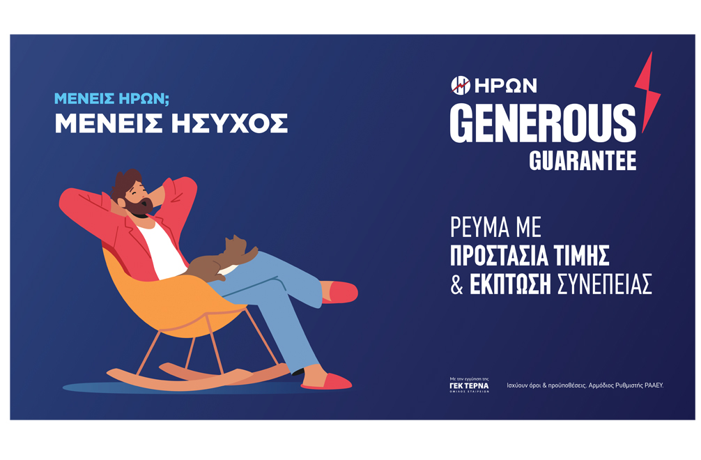 Τέλος, οι καταναλωτές μπορούν να μάθουν περισσότερα και να επιλέξουν το ΗΡΩΝ GENEROUS GUARANTEE καθώς και τα υπόλοιπα προγράμματα ηλεκτρικής ενέργειας της οικογένειας GENEROUS στο heron.gr, σε ένα κατάστημα ΗΡΩΝ ή στο 18228.
