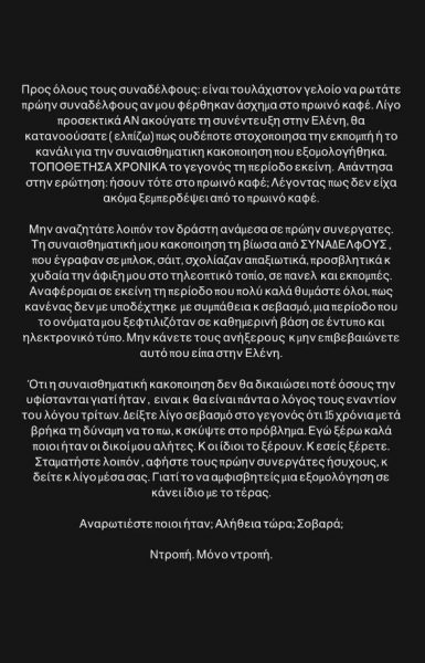 «Προς όλους τους συναδέλφους είναι τουλάχιστον γελοίο να ρωτάτε πρώην συναδέλφους μου αν μου φέρθηκαν άσχημα στον Πρωινό Καφέ. Λίγο προσεκτικά αν ακούγατε τη συνέντευξη στην Ελένη, θα κατανοούσατε (ελπίζω) πως ουδέποτε στοχοποίησα την εκπομπή ή το κανάλι για τη συναισθηματική κακοποίηση που εξομολογήθηκα. Απάντησα στην ερώτηση: ήσουν τότε στον Πρωινό Καφέ; Λέγοντας πως ακόμη δεν είχα ξεμπερδέψει από τον Πρωινό Καφέ.