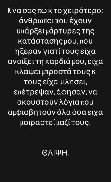 «Πολλοί από εσάς ήσασταν μάρτυρες και συμπαραστάτες. Άλλοι ήσασταν συμμέτοχοι και ενορχηστρωτές. Κάποιοι έχετε ζητήσει και συγγνώμη άλλοι δημόσια και κάποιοι κατ’ ιδίαν. Ξέρετε ΟΛΟΙ ποιοι ήταν. Θέλετε ονόματα; Γιατί; Για την τιμωρία και τον παραδειγματισμό; Όχι βέβαια! Για το κουτσομπολιό θέλετε ονόματα. Το να δημιουργείτε σενάρια από την εξομολόγησή μου και να τη μετατρέπετε σε γκοσιπάκι για το κουτσομπολιό δεν σας τιμά. Έχετε μία δύναμη. Να αναδείξετε το πρόβλημα. Δείτε το πρόβλημα. Συμβαίνει παντού. Συνέχεια. Μπορεί να έχει συμβεί και σε εσάς. Επιτέλους, επιτέλους…