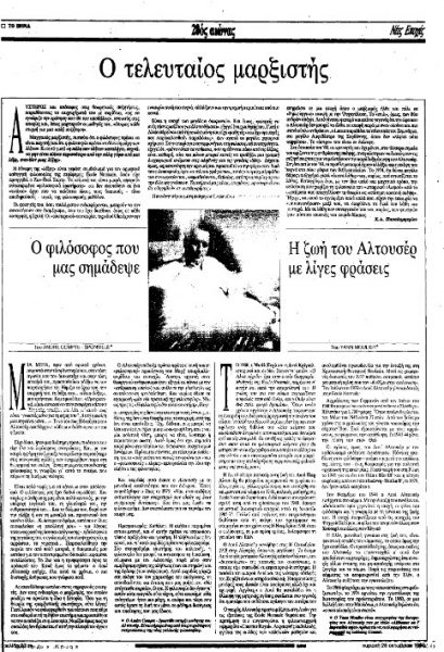 Είναι πολύ νωρίς για να κάνουμε έναν απολογισμό. Ο φιλόσοφος μάς έχει βαθιά σημαδέψει. Και κυρίως ο άνθρωπος μάς είναι πολύ κοντινός, με την υπέροχη ευγένειά του, τη γλυκύτητά του, την ευθραυστότητά του. Και το βλέμμα του, βαρύ σαν την πλήξη ή σαν τη μοναξιά και προσεκτικό όσο κανένα άλλο. Κι ύστερα το δράμα, αυτό που ο ίδιος αποκαλούσε «η απαλλαγή μου» —για λόγους ταπεινοφροσύνης όσο και απόγνωσης—, η δολοφονία της γυναίκας του, ο εγκλεισμός του στο ψυχιατρείο, η αρρώστια, τα γηρατειά. Παρακολούθησα την πορεία του από πολύ μακριά, ο θαυμασμός μου ωστόσο για τον κατεστραμμένο δάσκαλο παραμένει αναλλοίωτος. Το ίδιο και η τρυφερότητα προς το πρόσωπό του. Κακά όμως τα ψέματα: ο Λουί Αλτουσέρ υπήρξε, όλα αυτά τα χρόνια, ο πιο δυστυχής άνθρωπος που γνώρισα ποτέ.