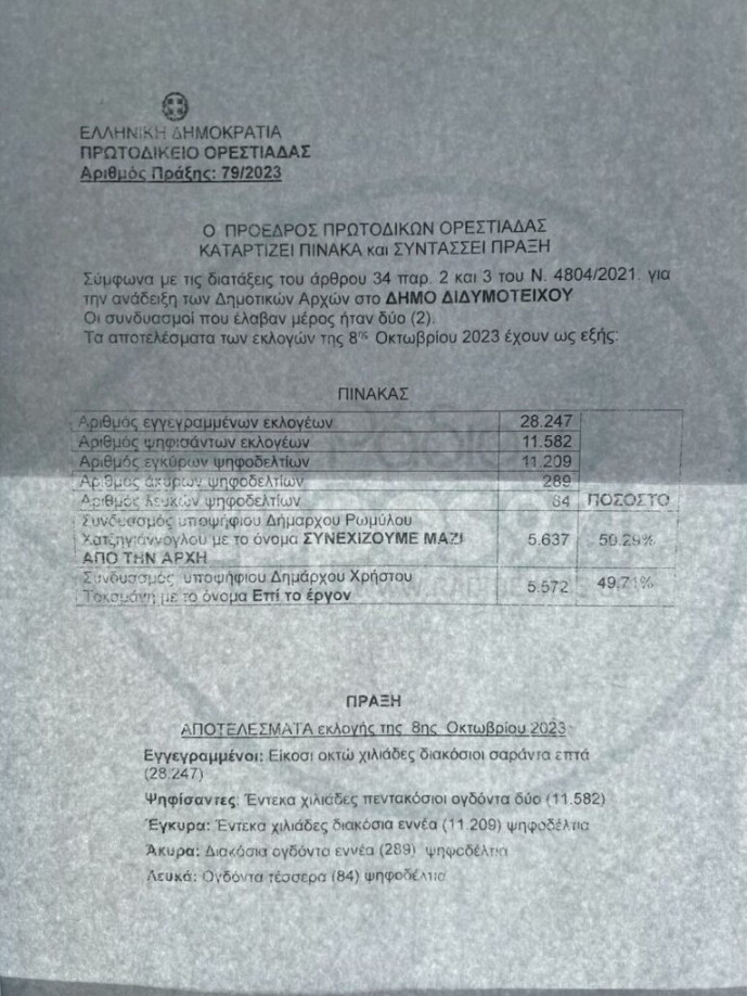 Συγκεκριμένα, στα επίσημα αποτελέσματα της 8ης Οκτωβρίου, πρώτος εμφανίστηκε ο Χρήστος Τοκαμάνης με 50,02% και 5.607 ψήφους έναντι 49,98% και 5.602 ψήφους του Χατζηγιάννογλου. Ωστόσο σήμερα Τρίτη (17/10) ολοκληρώθηκαν και θυροκολλήθηκαν τα επίσημα πλέον αποτελέσματα των δημοτικών εκλογών, από το Πρωτοδικείο Ορεστιάδας. Σύμφωνα με αυτά, ξεκάθαρα και επίσημα πλέον ο Ρωμύλος Χατζηγιάννογλου συνεχίζει να είναι δήμαρχος Διδυμοτείχου με οριακή διαφορά 65 ψήφων από τον κ. Τοκαμάνη και σε ποσοστά 50,29% έναντι 49,71%