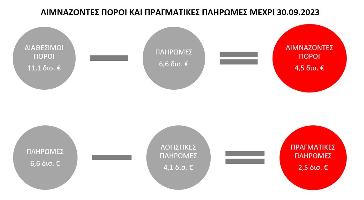 Ο Σωκράτης Φάμελλος παραθέτει στοιχεία του Ινστιτούτου Εναλλακτικών Πολιτικών (ΕΝΑ), βάσει των οποίων έγιναν «μόνο 2,5 δισ. ευρώ πραγματικές πληρωμές», ενώ υπάρχουν «4,5 δισ. ευρώ λιμνάζοντες πόροι»