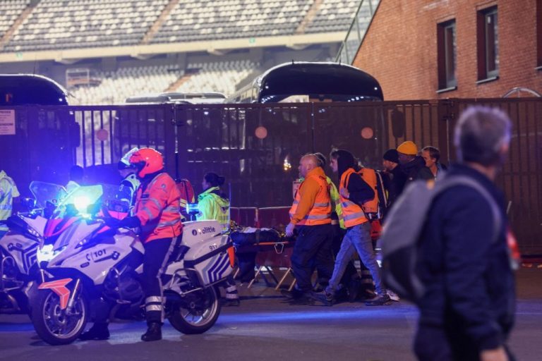 Μεταφέρεται ένα άτομο σε φορείο έξω από το King Baudouin μετά τη διακοπή της αναμέτρησης λόγω των πυροβολισμών στις Βρυξέλλες,