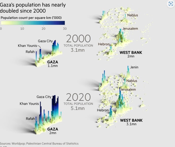 Η Γάζα είναι εδώ και πολύ καιρό πιο πυκνοκατοικημένη, αλλά η διαφορά αυτή έχει αυξηθεί αισθητά τις τελευταίες δύο δεκαετίες.