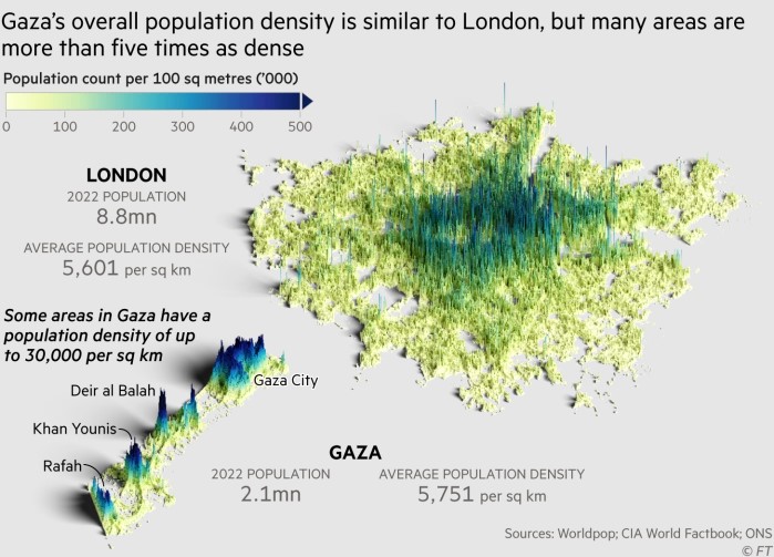 Η ραγδαία ανάπτυξη έδωσε στη Γάζα πληθυσμιακή πυκνότητα παρόμοια με του Λονδίνου. Αλλά πιο λεπτομερή στοιχεία δείχνουν ότι πολλές περιοχές είναι έως και έξι φορές πιο πυκνές. Αυτό περιλαμβάνει τα τμήματα της βόρειας Γάζας, συμπεριλαμβανομένης της πόλης της Γάζας, όπου περίπου 1,1 εκατ. πολίτες ενημερώθηκαν από το Ισραήλ ότι πρέπει να εκκενώσουν προς τον νότο.