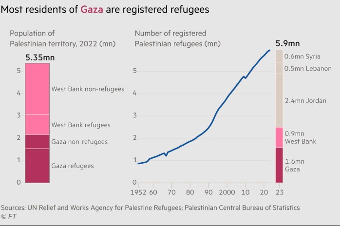 Αλλά από αυτούς που βρίσκονται στα παλαιστινιακά εδάφη, σχεδόν τα δύο τρίτα, ή 1,6 εκατομμύρια, βρίσκονται στη Γάζα. Οι κάτοικοι της Γάζας που δεν ορίζονται επίσημα ως πρόσφυγες, συνήθως επειδή είναι απόγονοι ντόπιων, ζουν υπό ισραηλινή κατοχή.