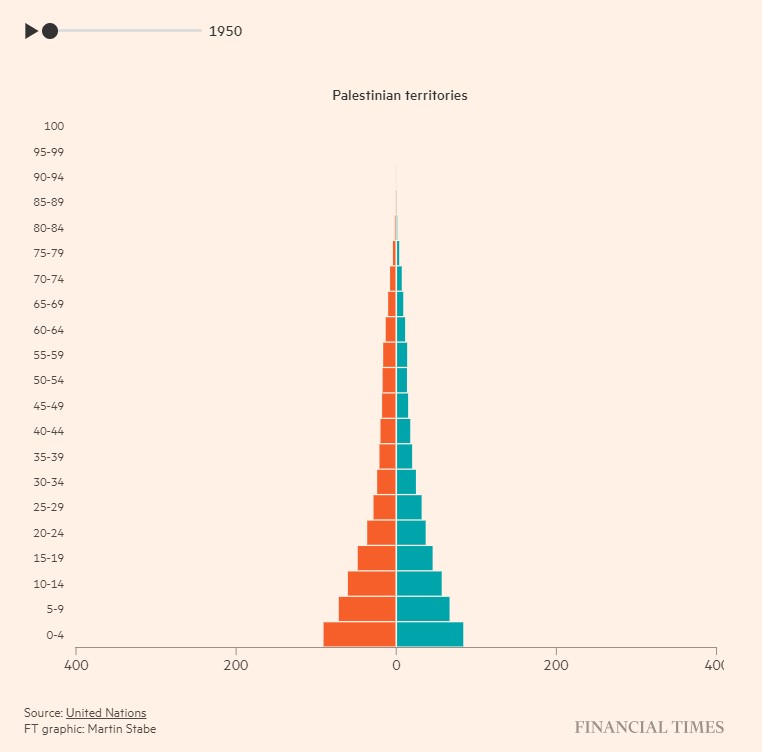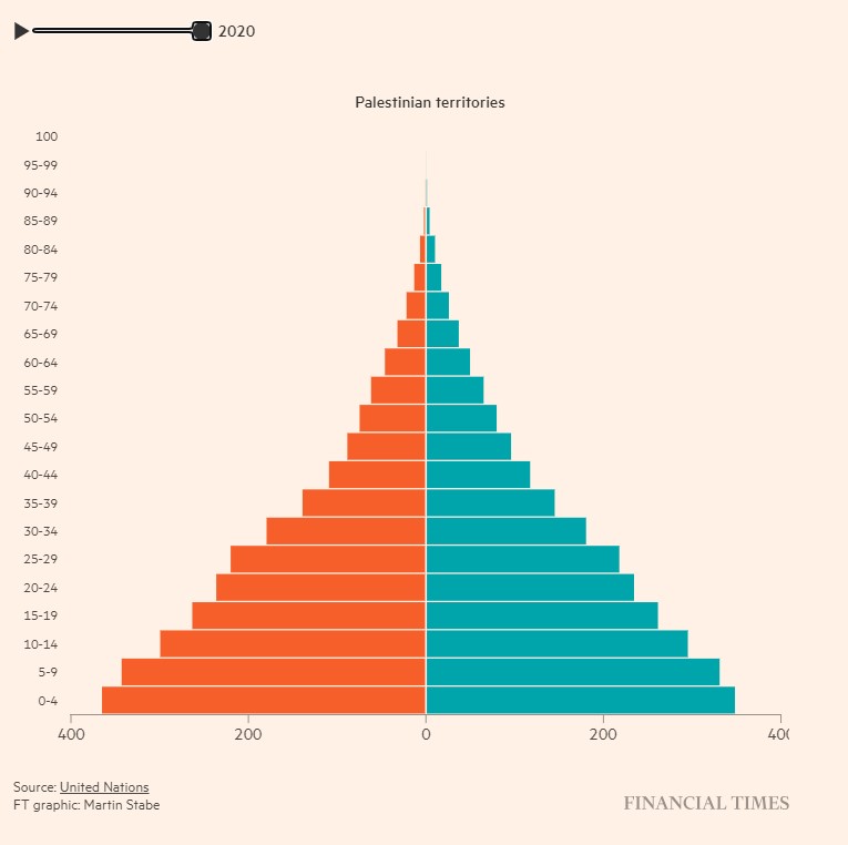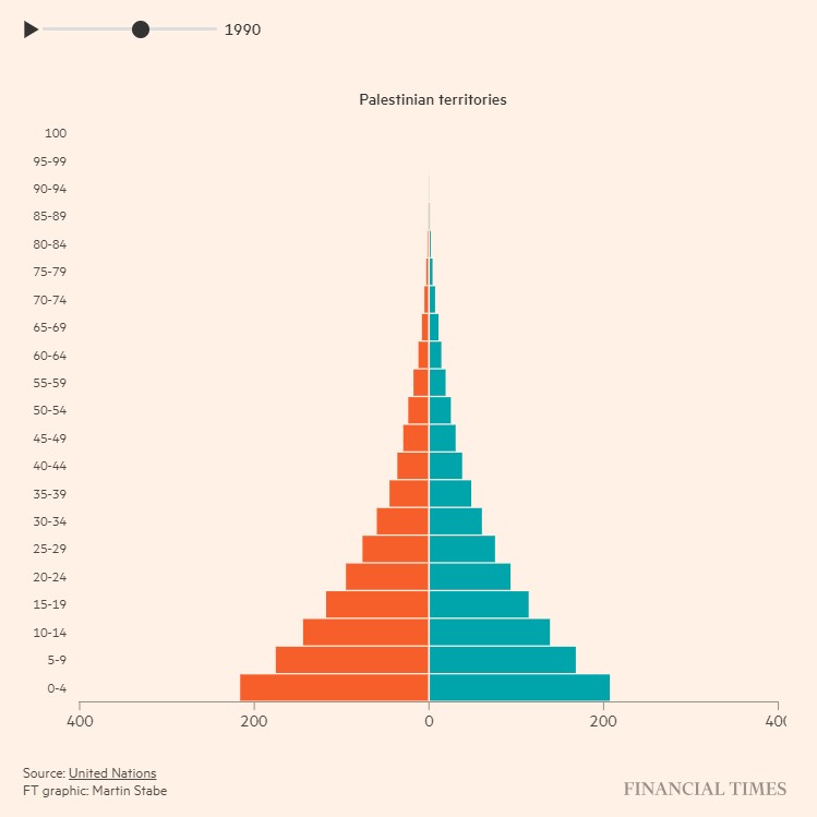 Τα παλαιστινιακά εδάφη της Γάζας και της Δυτικής Όχθης αποτελούν από τα λίγα μέρη εκτός της υποσαχάριας Αφρικής που έχουν μέση ηλικία κάτω από 20 έτη.
