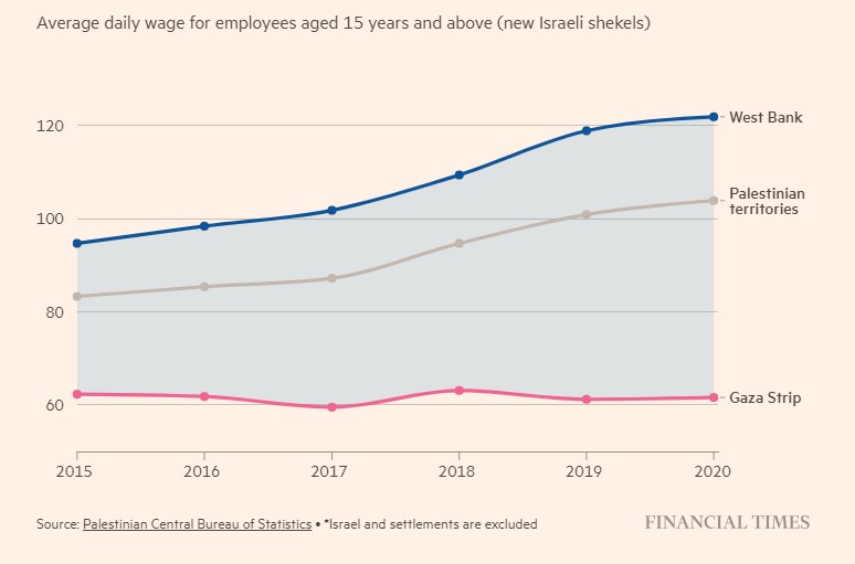 Οι ονομαστικοί μέσοι μισθοί της Γάζας ήταν επίσης το 2020 οι μισοί από εκείνους της Δυτικής Όχθης, με το χάσμα να διευρύνεται αισθητά τα τελευταία πέντε χρόνια.