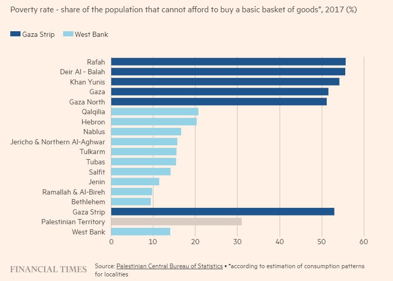 Περισσότερο από το ήμισυ του πληθυσμού της Γάζας εκτιμάται ότι ζούσε σε συνθήκες φτώχειας το 2017, η οποία ορίζεται ως αδυναμία πληρωμής ενός βασικού καλαθιού αγαθών. Τα ποσοστά φτώχειας ήταν σημαντικά χαμηλότερα – αλλά εξακολουθούν να είναι σημαντικά – στις περιοχές της Δυτικής Όχθης.