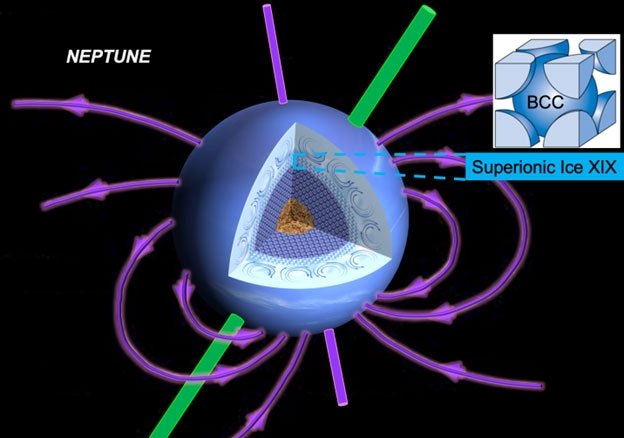 Διάγραμμα που δείχνει σε ποιο βάθος μπορεί να κρύβεται ο Πάγος ΧΙΧ του Ποσειδώνα. Οι μοβ γραμμές δείχνουν το μαγνητικό πεδίο του πλανήτη ( SLAC National Accelerator Laboratory)