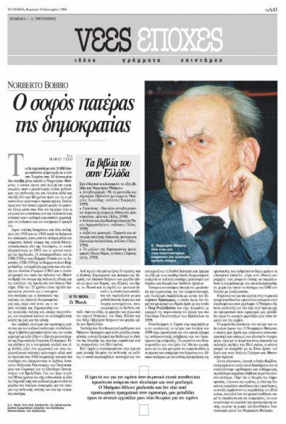 Το ότι περισσότερα από 10.000 άτομα απέτισαν φόρο τιμής σε αυτόν στο Τουρίνο στις 10 Ιανουαρίου δεν συνέβη μόνο επειδή ο Νορμπέρτο Μπόμπιο, ο οποίος έφυγε από τη ζωή την προηγουμένη, ήταν ο μεγαλύτερος ιταλός φιλόσοφος της πολιτικής και του δικαίου, αλλά και επειδή εδώ και 60 χρόνια ήταν για το ευρύ κοινό ένας φιλόσοφος στρατευμένος. Εκείνο όμως που τον έκανε μερικές φορές να φαίνεται ξένος μέσα στην ίδια του τη χώρα ήταν η αστρική του απόσταση από την πολιτικάντικη πολιτική και ο καθαρά ευρωπαϊκός χαρακτήρας του πολιτικού και του πνευματικού προφίλ του.