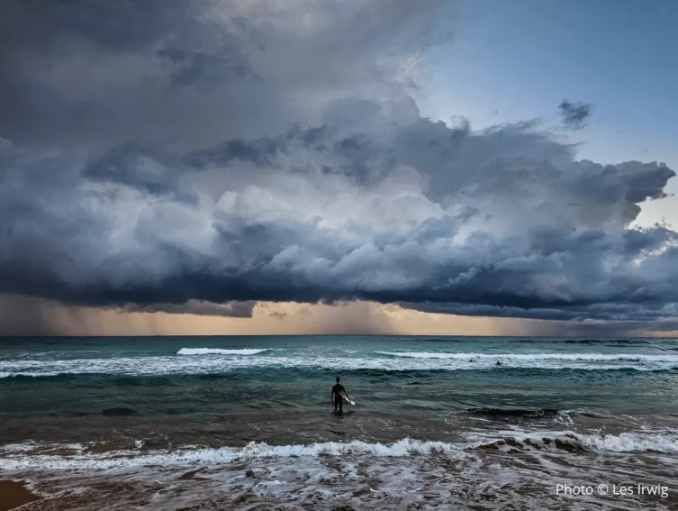 Ο Les Irwig ανακηρύχθηκε νικητής του διαγωνισμού Standard Chartered Smartphone Weather Photographer of the Year για την εικόνα του, Braving the Storm. Το πρωινό φως της ανατολής περιβάλλει τα πυκνά σύννεφα με μια θερμή λάμψη, ενώ στο βάθος βροχή. Η ανατολή του ήλιου ξεχωρίζει για τις φιλόξενες, ζεστές αποχρώσεις της που οφείλονται στις ακτίνες του ήλιου που διανύουν μεγάλη απόσταση διαμέσου της ατμόσφαιρας.