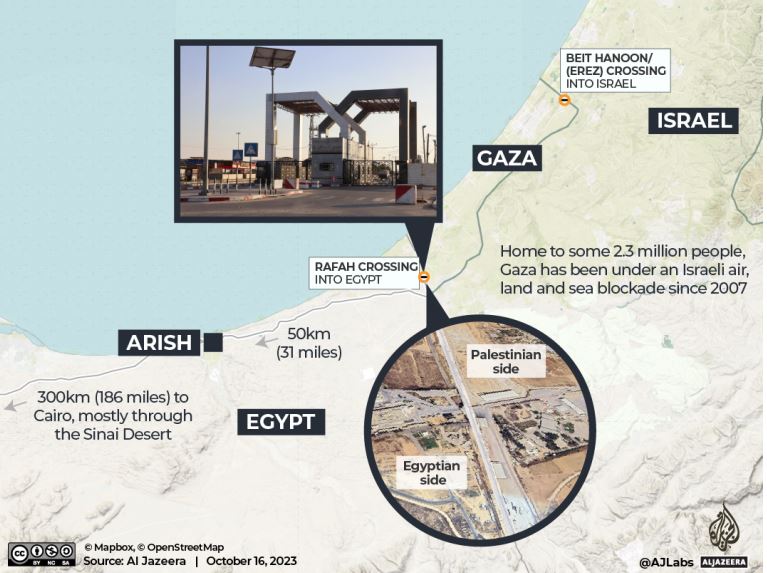 Ο υπουργός Εξωτερικών της Αιγύπτου Sameh Shoukry δήλωσε στην εκπομπή Newshour του BBC ότι από τη σκοπιά της Αιγύπτου, «το πέρασμα της Ράφα από τη δική μας πλευρά είναι επίσημα ανοιχτό«, αλλά κατηγόρησε τους «αεροπορικούς βομβαρδισμούς» ότι καθιστούν το πέρασμα «απρόσιτο» και ανασφαλές για τα φορτηγά με βοήθεια που περνούν στη Γάζα.
