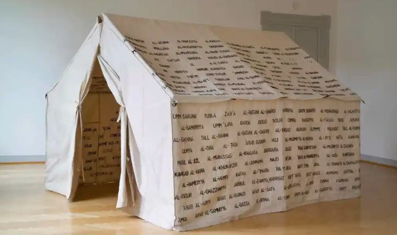 Emily Jacir, Μνημείο για τα 418 παλαιστινιακά χωριά που καταστράφηκαν, ερημώθηκαν και κατελήφθησαν από το Ισραήλ το 1948 / Σκηνή προσφύγων, κλωστή κεντήματος, βιβλίο καταγραφής, 2021