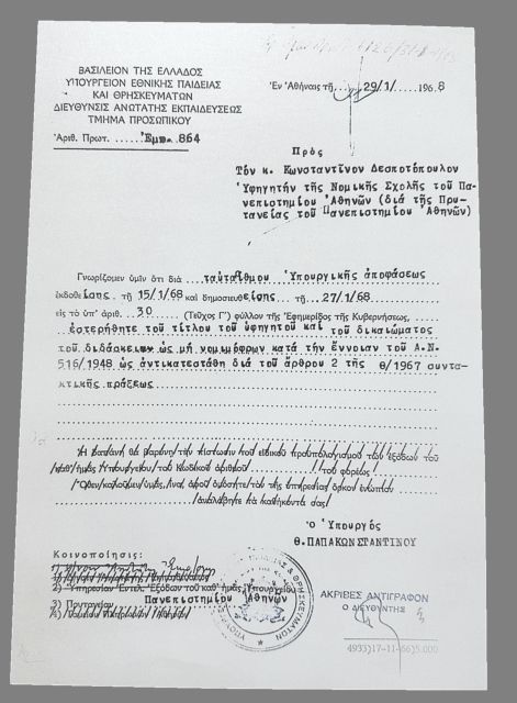 Εγγραφο απόλυσης του υφηγητή της Νομικής Σχολής Κωνσταντίνου Δεσποτόπουλου (29/1/1968)