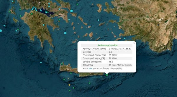 Σεισμός 3,9 Ρίχτερ σημειώθηκε νωρίς το πρωί του Σαββάτου (21/10) νοτιοανατολικά της Ζάκρου στην Κρήτη.