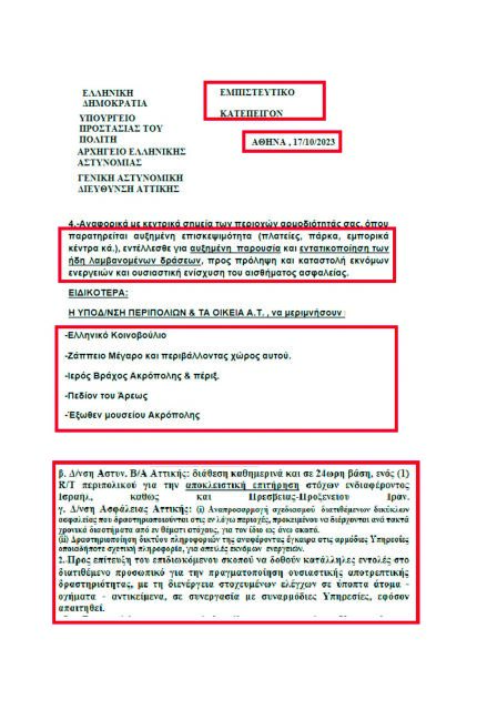 Στα έγγραφα της ΕΛ.ΑΣ. ζητείται από την αρμόδια Διεύθυνση Αστυνομίας Αθηνών, την Υπηρεσία Περιπολιών, το Τμήμα Ασφαλείας και το Τμήμα Αλλοδαπών της ΓΑΔΑ «να υπάρχει αστυνομική επιτήρηση μέχρι και σε πλατείες, πάρκα και άλλα κεντρικά σημεία όπου καταγράφεται υψηλή επισκεψιμότητα», σε ένα σαφές δείγμα της εγρήγορσης αλλά και του εύρους των προληπτικών ενεργειών για την αποφυγή τυφλών πληγμάτων στη χώρα μας.