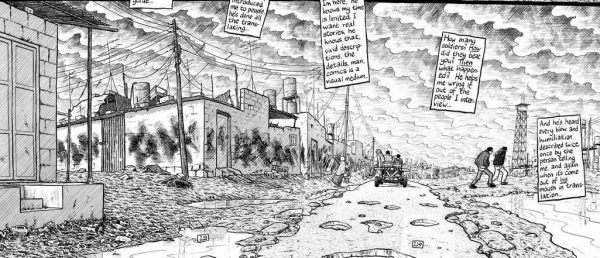 Αυτό το αφηγηματικό ύφος επιτρέπει στον Sacco να μεταφέρει πολύ περισσότερες πληροφορίες σχετικά με πολιτικά ζητήματα από ό,τι είναι δυνατόν μέσω του διαλόγου και μόνο.
