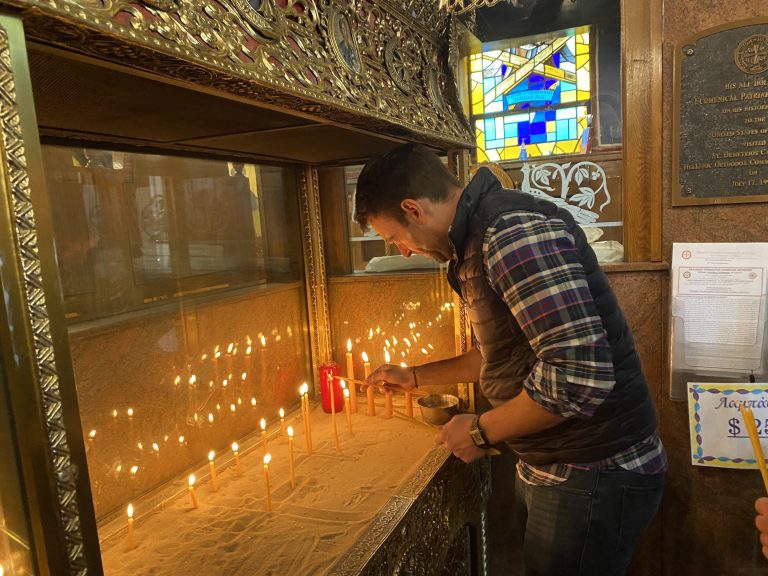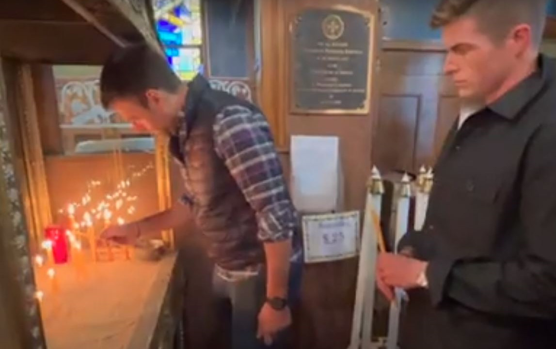 Ο Στέφανος Κασσελάκης ανάβει κερί στον Ι.Ν. Αγίου Δημητρίου Αστόριας (Πηγή: Εθνικός Κήρυκας/Χ. Αθανασάτος)