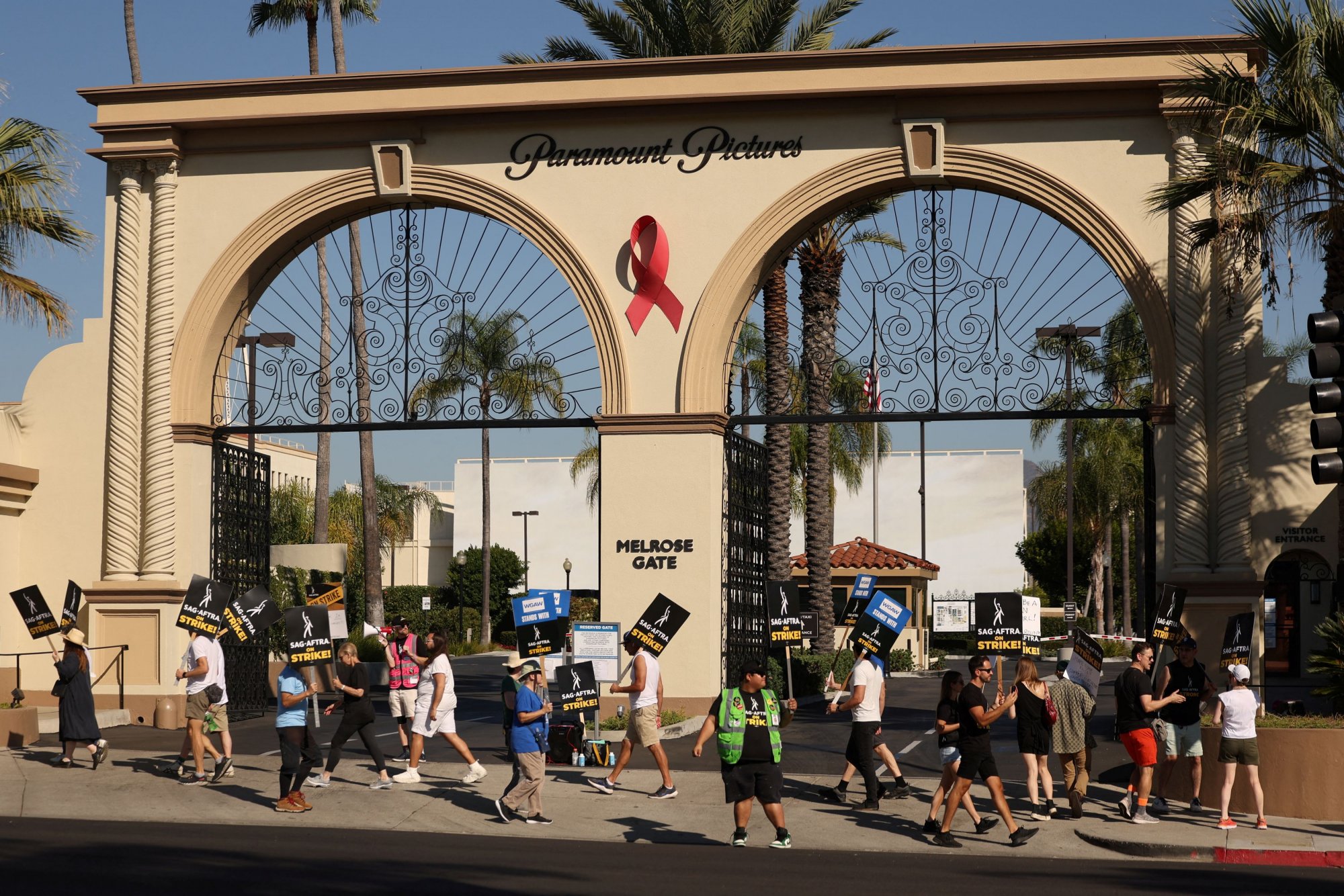 Μέλη του συνδικάτου SAG-AFTRA πραγματοποιούν πορεία στους δρόμους γύρω από τα στούντιο Paramount στο Λος Άντζελες, κατά την 100ή ημέρα της απεργίας.