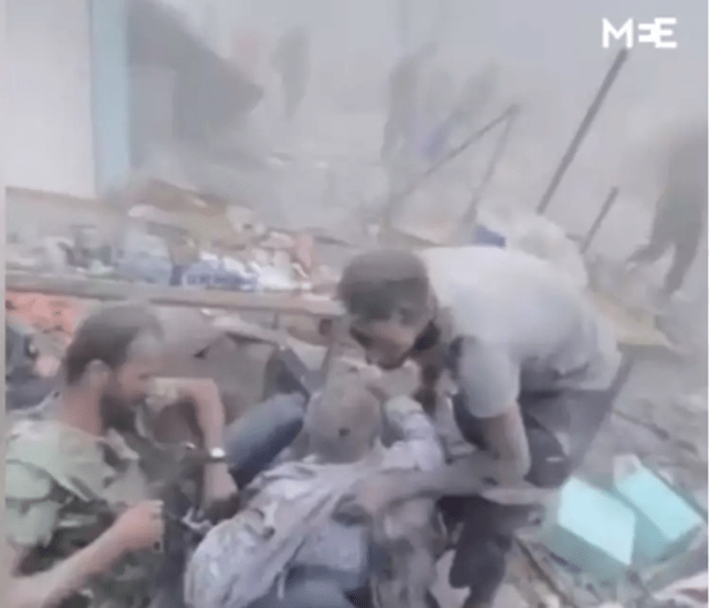 Προς το τέλος του βίντεο διακρίνονται κάποιοι άνδρες να προσπαθούν να σηκώσουν μία γυναίκα, η οποία φαίνεται να μην έχει τις αισθήσεις της. Τα ασθενοφόρα εξακολουθούν να απομακρύνουν πολίτες που χτυπήθηκαν από θραύσματα της ισραηλινής επιδρομής.