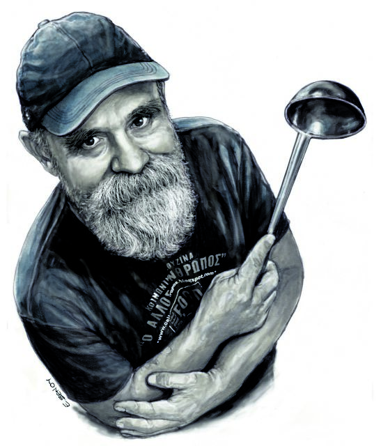 Κατά τη διάρκεια ενός γεύματος στον «Μπαχανέζο», ακριβώς απέναντι από την έδρα του στρατηγείου του στον Κεραμεικό, και ενώ είχε μόλις επιστρέψει από το χάος των «πληγωμένων» χωριών της Θεσσαλίας, ο 59χρονος ιδρυτής της κοινωνικής κουζίνας, με την οποία έχει τα τελευταία δώδεκα χρόνια μαγειρέψει και μοιραστεί 20 εκατομμύρια μερίδες με τους περαστικούς – με 17 αυτοδιαχειριζόμενες κουζίνες σε όλη την Ελλάδα και 4 στο εξωτερικό –μου αφηγήθηκε μέσα σε λιγότερο από μία ώρα όλη του τη ζωή.
