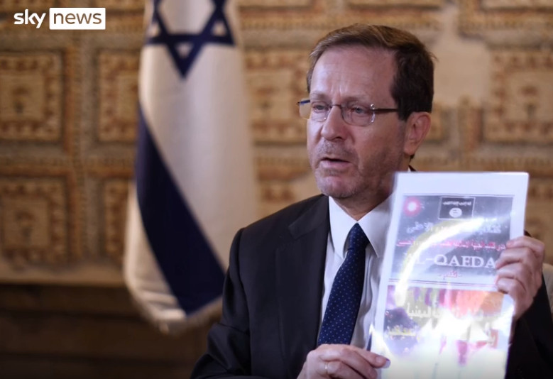 Σε συνέντευξή του στο Sky News ο Χέρτζογκ δήλωσε ότι βρέθηκε σε σορό νεκρού μαχητή της Χαμάς σε κιμπουτς, όπου εκτιμάται ότι σκοτώθηκε ή απήχθη το 20% των κατοίκων του, οδηγίες της Αλ Κάιντα για το πώς θα επιχειρήσουν και πώς να δημιουργήσουν ένα είδος μη επαγγελματικού χημικού όπλου με κυάνιο».