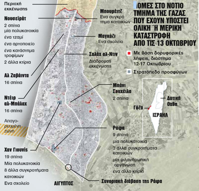 Ο ισραηλινός στρατός προειδοποιεί τους κατοίκους της Γάζας ότι κινδυνεύουν να αναγνωριστούν ως συνεργοί «σε τρομοκρατική οργάνωση» εάν δεν μετακινηθούν νότια. Το υπουργείο Υγείας στη Γάζα ανακοίνωσε χθες ότι από τις 7 Οκτωβρίου έχουν χάσει τη ζωή τους 4.651 Παλαιστίνιοι, εκ των οποίων το 40% είναι παιδιά.