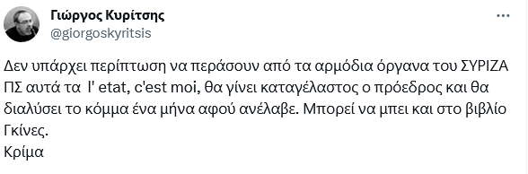 Ο πρώην βουλευτής του ΣΥΡΙΖΑ-ΠΣ Γιώργος Κυρίτσης υπογράμμισε σε ανάρτηση στο Χ (πρώην Twitter) ότι «δεν υπάρχει περίπτωση να περάσουν από τα αρμόδια όργανα του ΣΥΡΙΖΑ ΠΣ αυτά τα l’ etat, c’est moi, θα γίνει καταγέλαστος ο πρόεδρος και θα διαλύσει το κόμμα ένα μήνα αφού ανέλαβε. Μπορεί να μπει και στο βιβλίο Γκίνες. Κρίμα».
