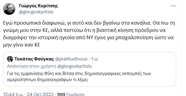 Λίγο αργότερα, σε νέο tweet του, ανέφερε πως «θα πω τη γνώμη μου στην ΚΕ, αλλά πιστεύω ότι η βιαστική κίνηση πρόεδρου να διαγράψει την ιστορική ηγεσία από ΝΥ έγινε για μπαχαλοποίηση ώστε να μην γίνει καν ΚΕ (σ.σ. Κεντρική Επιτροπή».