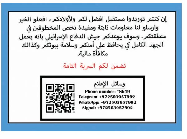 Έτσι σήμερα ο στρατός της χώρας προχώρησε στη διανομή φυλλαδίων στη Λωρίδα της Γάζας, μέσω των οποίων ζητά από τους κατοίκους να του δώσουν οποιαδήποτε στοιχείο έχουν σχετικά με τους ομήρους, που ξεπερνούν τους 200.