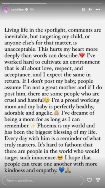 Η Πάρις Χίλτον μοιράστηκε αργότερα μια δήλωση σε insta story της ως απάντηση στα αρνητικά σχόλια που δέχεται μετά τη δημοσιοποίηση των φωτογραφιών με τον γιο της.
