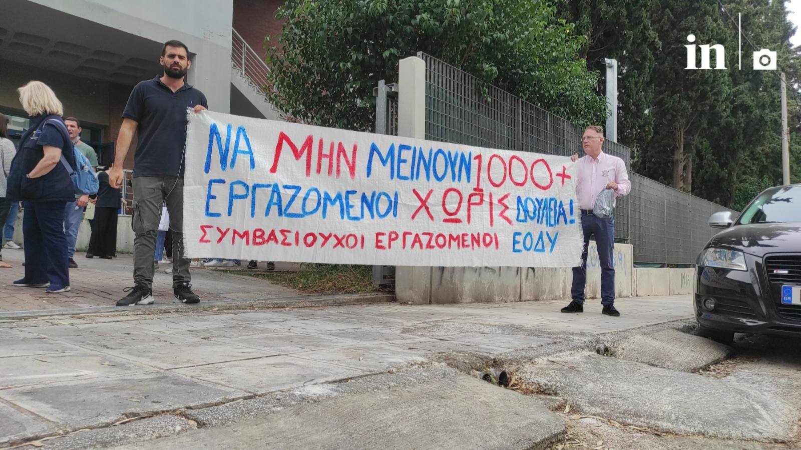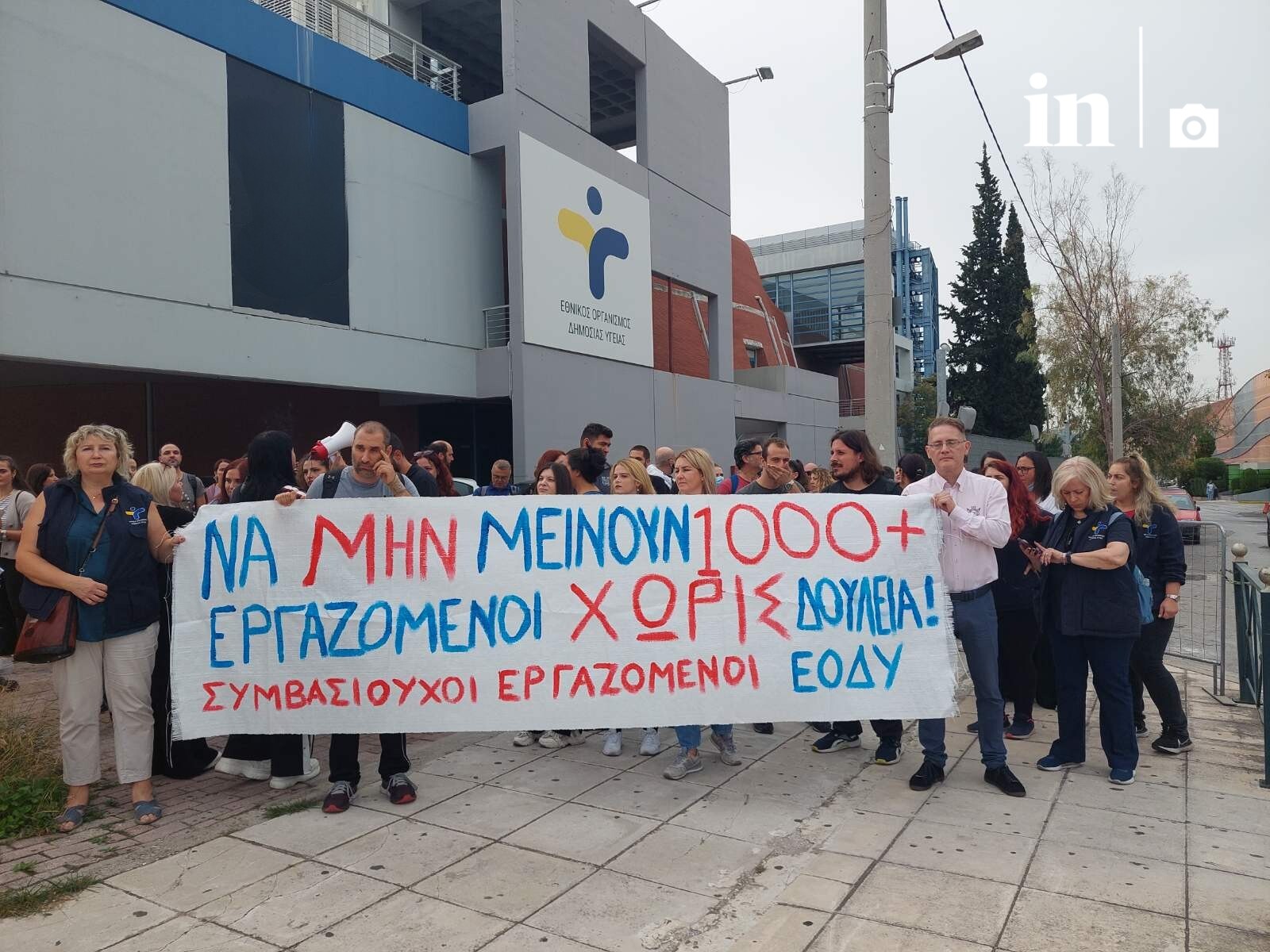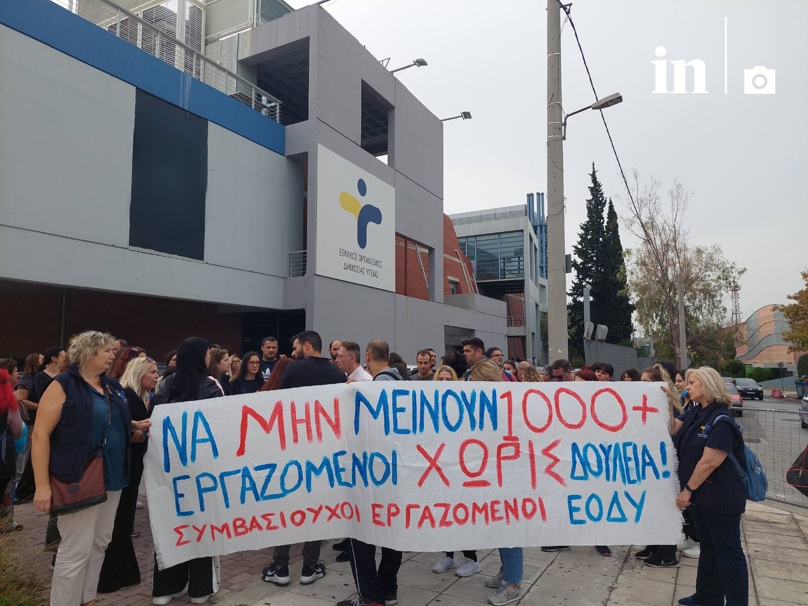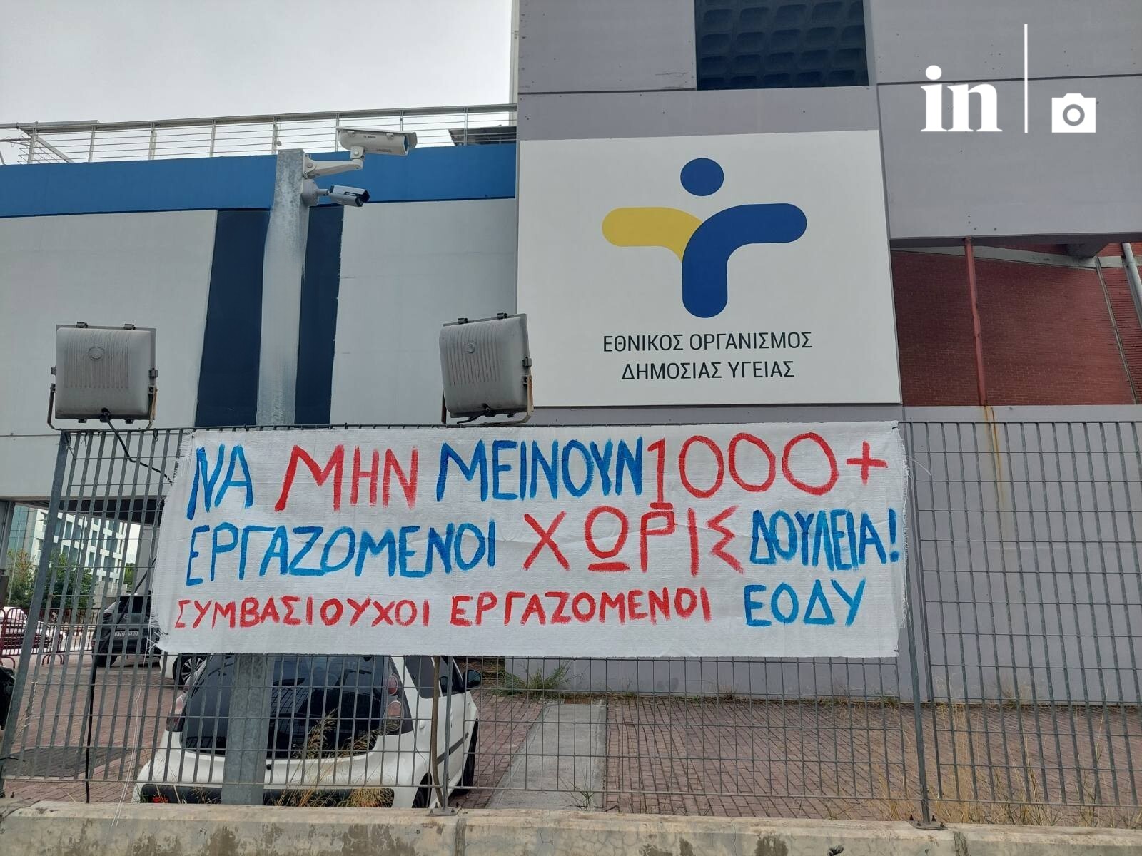 Όπως φαίνεται στις φωτογραφίες που εξασφάλισε το in, οι εργαζόμενοι πραγματοποίησαν κινητοποίηση έξω από τον ΕΟΔΥ και μάλιστα κρατάνε και πανό, στο οποίο ζητούν «να μην μείνουν 1.000+ εργαζόμενοι χωρίς δουλειά».