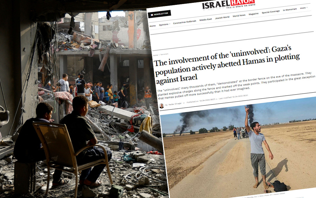 Η Israel Hayom επισημαίνει μάλιστα ότι πολλοί από τους χιλιάδες αμάχους γνώριζαν για τις πολεμικές προετοιμασίες, τις προώθησαν και τις κρατούσαν μυστικές. Αντίθετα χρωματίζει τις Ισραηλινές Αμυντικές Δυνάμεις ως έναν ηθικό στρατό, ο οποίος «δεν θα παρατάξει έναν άμαχο πληθυσμό κάνοντάς τους στόχο των όπλων, των αρμάτων μάχης, του πυροβολικού και των αεροπλάνων».