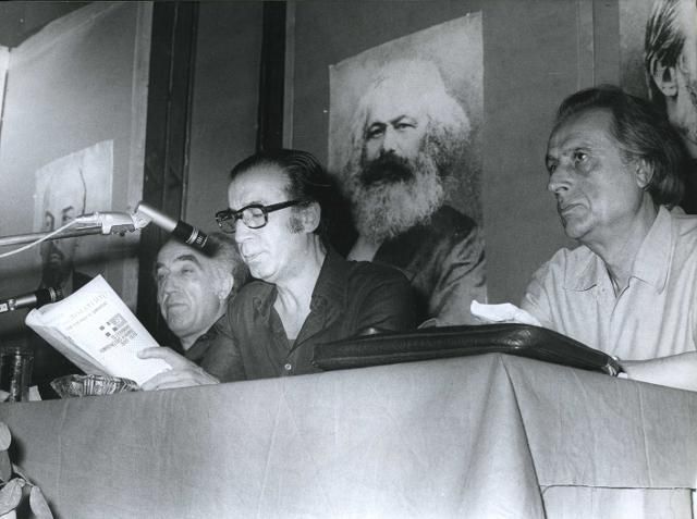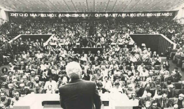 Από το 1ο Συνέδριο του ΚΚΕ Εσ. το 1976. Στο κέντρο ο Μπάμπης Δρακόπουλος, γραμματέας του κόμματος. Ηταν ο επικεφαλής του «Γραφείου Εσωτερικού» στην Ελλάδα όταν έγινε η διάσπαση. Δεξιά ο Πάνος Δημητρίου