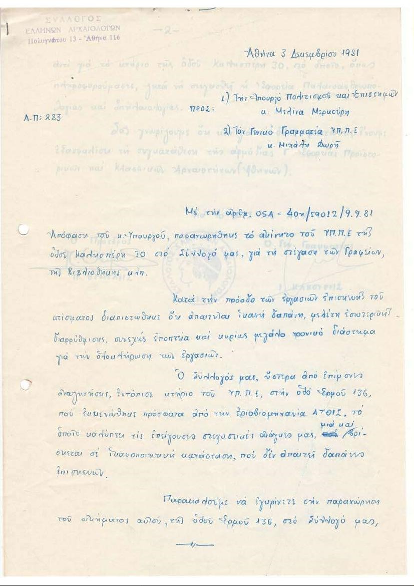 Σε έγγραφο του Ιστορικού Αρχείου του ΣΕΑ με ημερομηνία 3 Δεκεμβρίου 1981, ο Πέτρος Θέμελης ζητά από τη νέα Υπουργό Πολιτισμού και Επιστημών, Μελίνα Μερκούρη τη στέγαση του Συλλόγου στο – άρτι απελευθερωθέν από τους προηγούμεννους ενοίκους – κτήριο κυριότητας του Υπουργείου επί της οδού Ερμού, 136 «για τις επείγουσες στεγαστικές ανάγκες» του Συλλόγου. Αίτημα που έγινε δεκτό και σεβαστό για πάνω από τέσσερις δεκαετίες.»