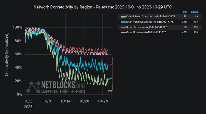 ⚠️ Confirmed: Real-time network data show that internet connectivity is being restored in the #Gaza Strip; service was disrupted on Friday amid heavy bombardment by Israel, leaving most residents cut off from the outside world at a critical moment 📈 pic.twitter.com/I7hBa9L9I9