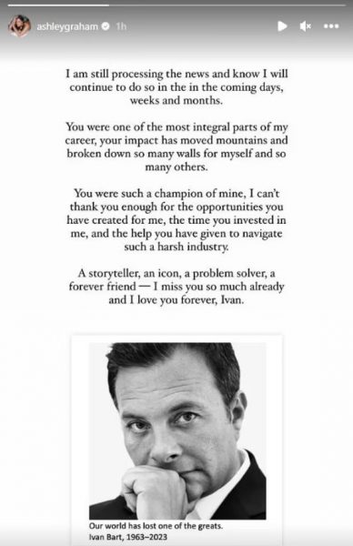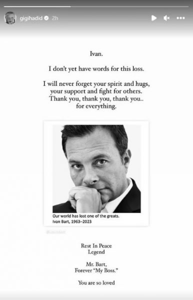 Η Τζίτζι Χαντίντ σημείωσε πως δεν έχει λόγια για την απώλεια του Ivan Bart. «Δεν θα ξεχάσω ποτέ το πνεύμα και τις αγκαλιές σου, την υποστήριξή σου και τη μάχη για τους άλλους. Σε ευχαριστώ, σε ευχαριστώ, σε ευχαριστώ… για όλα», υπογράμμισε. «Αναπαύσου εν ειρήνη θρύλε» έκλεισε.