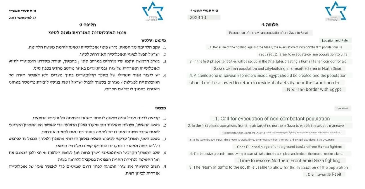 Verified document from Israeli Ministry of Intelligence on October 13 suggests forced displacement of Gaza civilians to Egypt would «yield positive and long term strategic results»