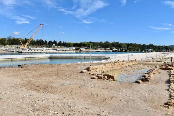 Το έργο περιλαμβάνει ανέλκυση των διάσπαρτων βυθισμένων μελών του μνημείου, δημιουργία θαλάσσιου φράγματος κατά μήκος της διόλκου και σε σχετικά μικρή απόσταση από αυτήν, που κατασκευάστηκε κατά τμήματα με πρανή θωρακισμένα από φυσικούς ογκόλιθους λατομείου και κατά τμήματα με κατακόρυφο μέτωπο που διαμορφώνεται με προκατασκευασμένα πλωτά κιβώτια από οπλισμένο σκυρόδεμα.