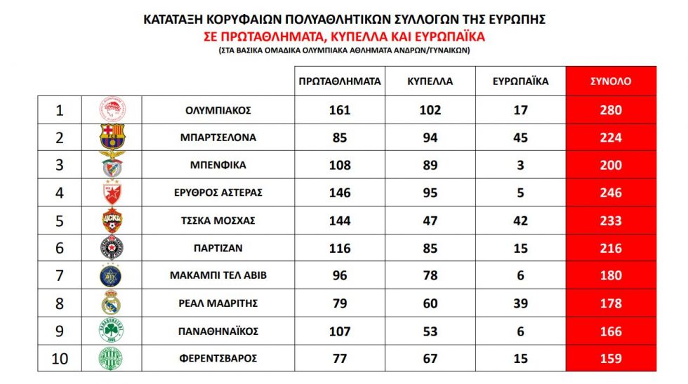 Πιο συγκεκριμένα ο Ολυμπιακός βρίσκεται στην πρώτη θέση της λίστας των κορυφαίων πολυαθλητικών συλλόγων της Ευρώπης όσον αφορά τα πρωταθλήματα, έχοντας συνολικά 161.