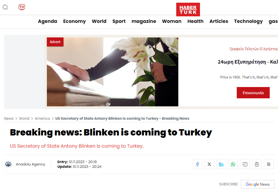 Σημειώνεται ότι το Στέιτ Ντιπάρτμεντ αρνήθηκε να επιβεβαιώσει τις πληροφορίες αυτές για επίσκεψη Μπλίνκεν στην Άγκυρα.