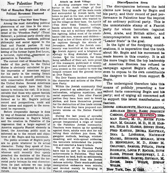 Η κριτική στάση της Άρεντ στην κατεύθυνση που έπαιρνε το σιωνιστικό κίνημα γινόταν όλο και πιο έντονη όσο κλιμακωνόταν η ένοπλη σύγκρουση που αποτέλεσε τη γενέθλια στιγμή του νέου κράτους. Δεν είναι τυχαίο ότι θα συντάξει και θα συνυπογράψει μαζί με άλλους σημαντικούς Εβραίους διανοουμένους, ανάμεσά τους τον Άλμπερτ Αϊνστάιν και τον Σίντνεϊ Χουκ, κείμενο που θα δημοσιευτεί τον Δεκέμβριο του 1948 στους New York Times στο οποίο θα καταγγέλλει τον Μεναχέμ Μπέγκιν και το κόμμα του, που λεγόταν «Χερούτ» (ελευθερία), ως ένα φασιστικό κόμμα, υπογραμμίζοντας μάλιστα τη σφαγή στο Αραβικό χωριό Ντέιρ Γιασίν τον Απρίλιο του 1948 ως ένα χαρακτηριστικό παράδειγμα αυτής της τρομοκρατικής βίας.